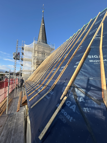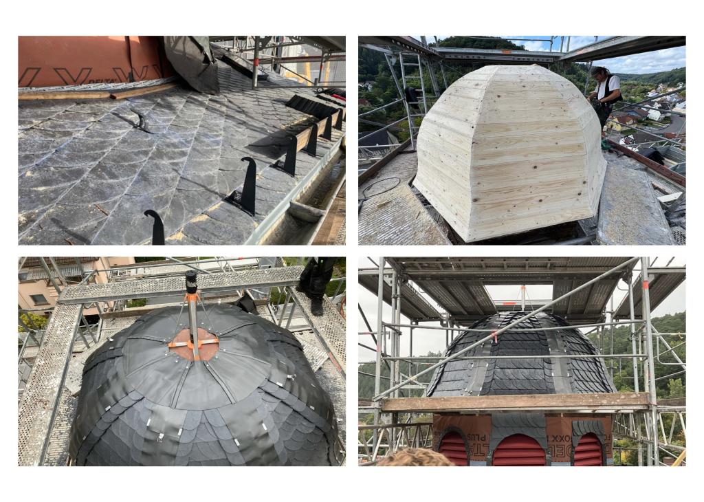 Die Eindeckung der Kuppeldachflächen mit Schiefer in Altdeutscher Deckung beginnt Ende November 2025.